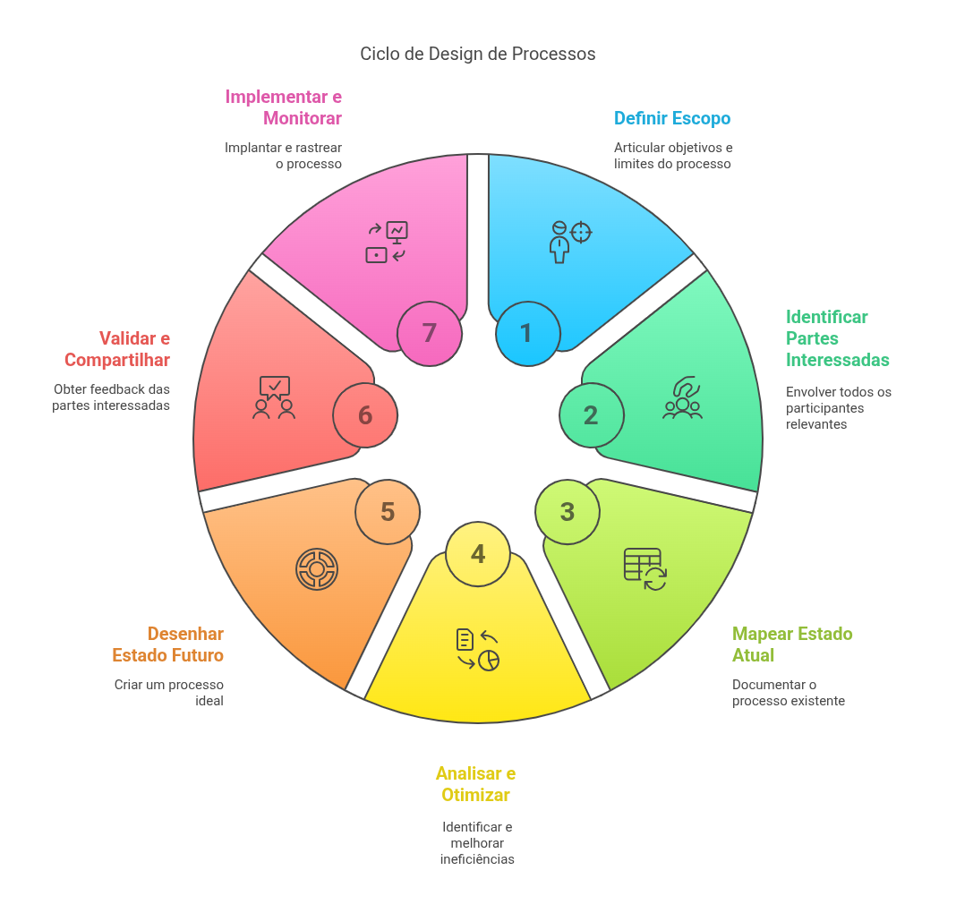 O design eficaz de processos é iterativo. Essas etapas e metodologias de suporte são frequentemente revisitadas à medida que as organizações evoluem ou à medida que insights do uso no mundo real levam a novos refinamentos.