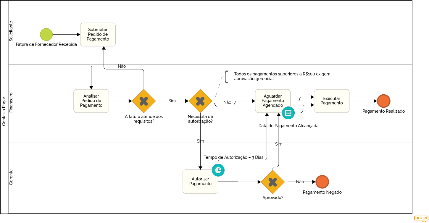 Melhor design: o processo inclui um gateway de decisão que encaminha automaticamente pagamentos acima de um limite definido para níveis adicionais de aprovação.