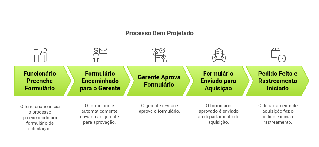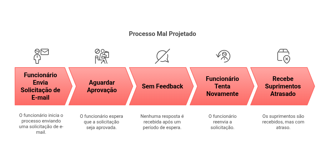 Compreender a diferença entre um processo mal projetado e um bem projetado é fundamental para entender o impacto do design de processo de negócio. Abaixo, percorremos um cenário de negócio simples, mas comum — solicitação de materiais de escritório — para destacar os resultados contrastantes que a qualidade do design pode criar.